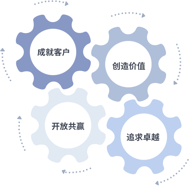 成就客户是一切决策的出发点,,,,创造价值是衡量所有工作的标准,,,追求卓越是我们做事做人的态度,,开放共赢是我们的格局也是最终的结果。。。价值观的齿轮环环相扣,,,,推动着组织里的每个人不断向前。。。